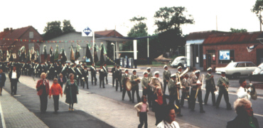 Sonntagmorgen um 6 Uhr war Wecken durch den Spielmannszug Hesedorf. Mittags war Antreten aller Schützen und anschließend Umzug durch den Ort mit Kranzniederlegung am Ehrenmal. Danach begann wieder auf allen Ständen das Schießen. KK 3 Schuss 1,- DM, Luftgewehr 3 Schuss 0,50 DM, abends war wieder Tanz.